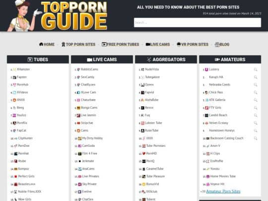 I like TopPornGuide, but my reviews are much longer. The organization of sites is praiseworthy, though, and a big plus for that sexy logo. Love the nipple slip. Maybe they could add a few more niches. Just a tiny recommendation from a fellow porn list site admin!