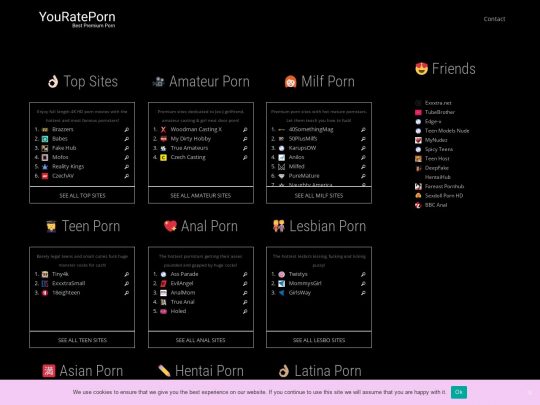 When we were writing about all these details, we realized that YouRatePorn is a good site. It is simple and the focus is on the content, the links you can open to find remarkable videos, pics, animations, etc. Perhaps there are not hundreds and hundreds of links, but we believe these are really great ones. We liked what they suggest, and we liked the sections. We also liked checking out their friends. This site is a jewel in the sea of porn list sites, and we think you should visit it as well.