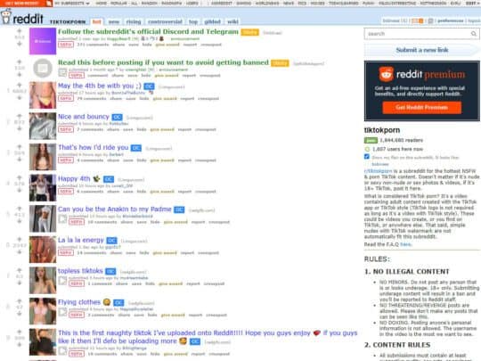 Type r/tiktokporn on Google, and you’ll find the hottest NSFW ’n porn TikTok content in a sec! As you can see, today I’ll write about TikTok Porn, something you can find on Reddit. You know what Reddit is, right? It’s one of the most popular sites in the world, especially cuz they have everything from TikTok porn to pretty much any topic in the world. You can find short porn videos on this subreddit, but you have all kinds of clips, GIFs, and pics here! Not just smutty, all topics are covered. Yet, you’re probably here because you wanna know about the smutty stuff. TikTok porn is basically a page with all kinds of nude and sexy non-nude photos ’n videos. Everything here is 18+ TikTok material, and anyone can post stuff here. You can do it, too! For this r/, you need to be of legal age.